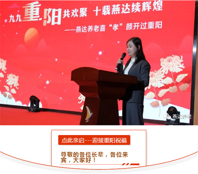 下午14點30整,“九九重陽共歡聚 ?十載燕達續(xù)輝煌——燕達養(yǎng)老喜‘孝’顏開過重陽”活動正式開始。燕達國際健康城副總裁李海燕女士隆重致辭。
