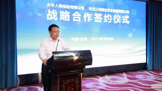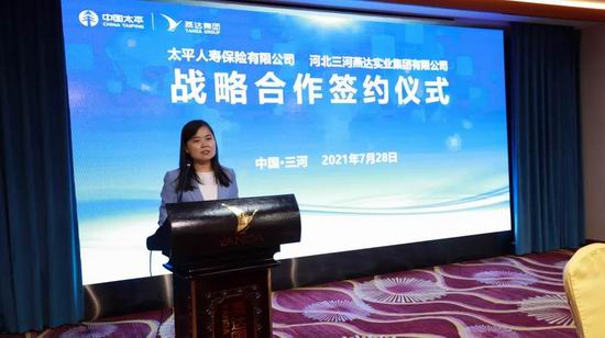 7月28日下午,太平人壽保險有限公司與河北三河燕達實業集團有限公司在燕達國際健康城隆重舉行戰略合作簽約儀式。雙方將攜手在醫療健康產業、聯合營銷、長期養老服務、保險服務等方面進行深度合作,打造出“保險金融+康養服務”的融合創新合作模式。燕達金色年華健康養護中心副總經理李東輝擔任活動主持。